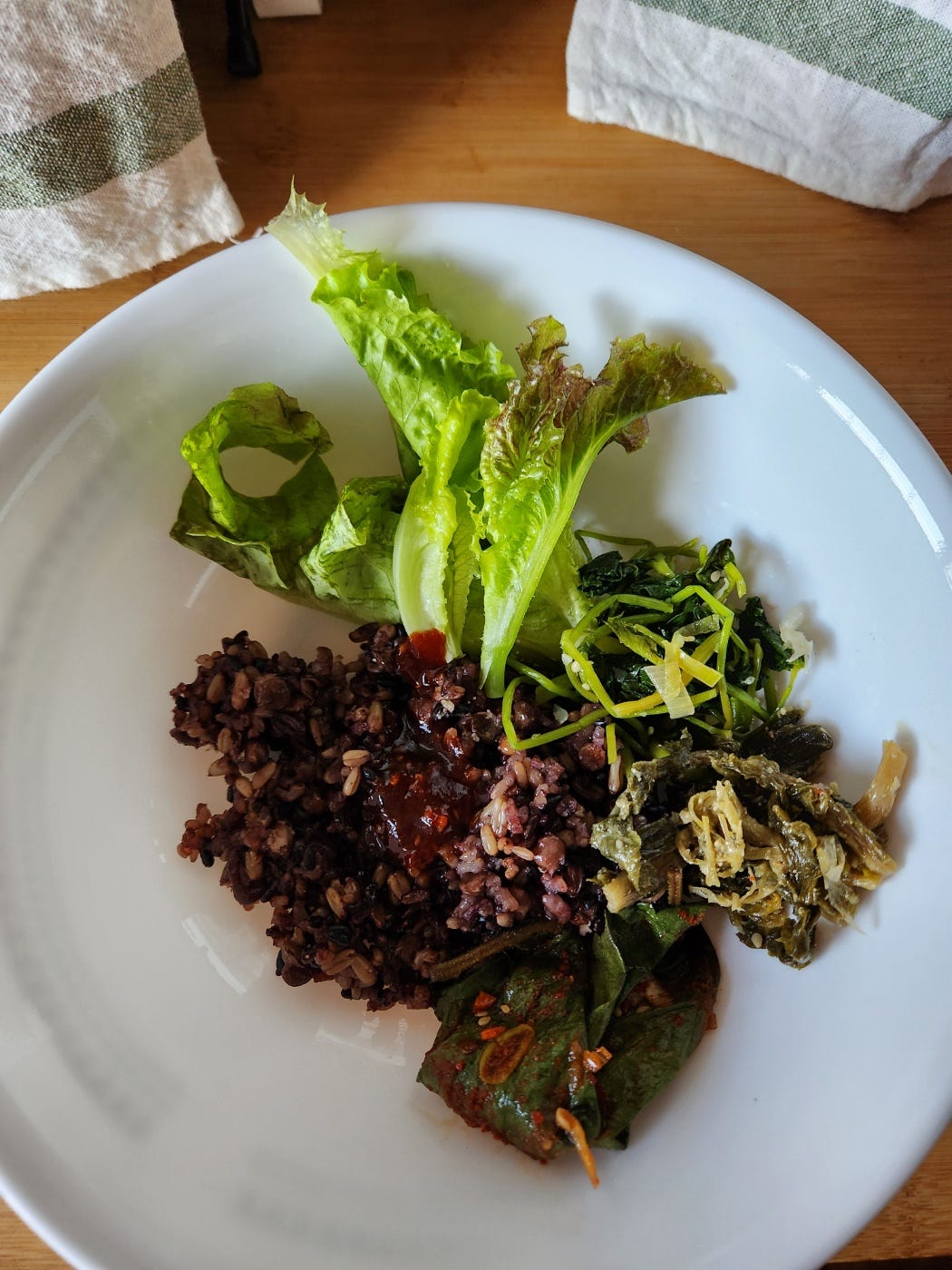 Bibimbap (Korean mixed rice) has become a go-to: 1) it’s super flexible and easy: all you need is whatever vegetables you have in the fridge (I usually go with namul, or Korean seasoned vegetables of various kinds) + a modicum of carbs (half a bowl of multigrain rice for me) + some sauce; 2) speaking of sauce, just a dash of some artisanal Korean gochujang or ganjang (soy sauce) and chamgireum (sesame oil) is all that is needed to turn the whole ensemble into a feast for the palate, so much so that it makes you forget the smaller portion size and the lack of your favorite comfort meats.