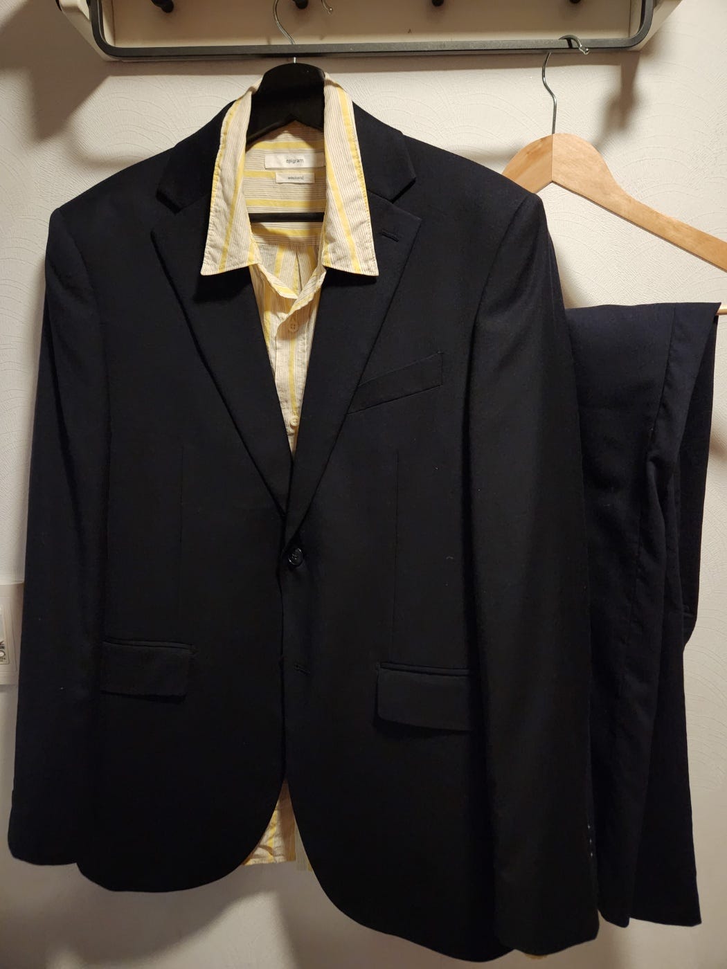 navy Ungaro Homme blazer, slightly oversized (my dad’s) + Epigram collared shirt with yellow stripes + navy Daniel Hechter slacks + black oxfords