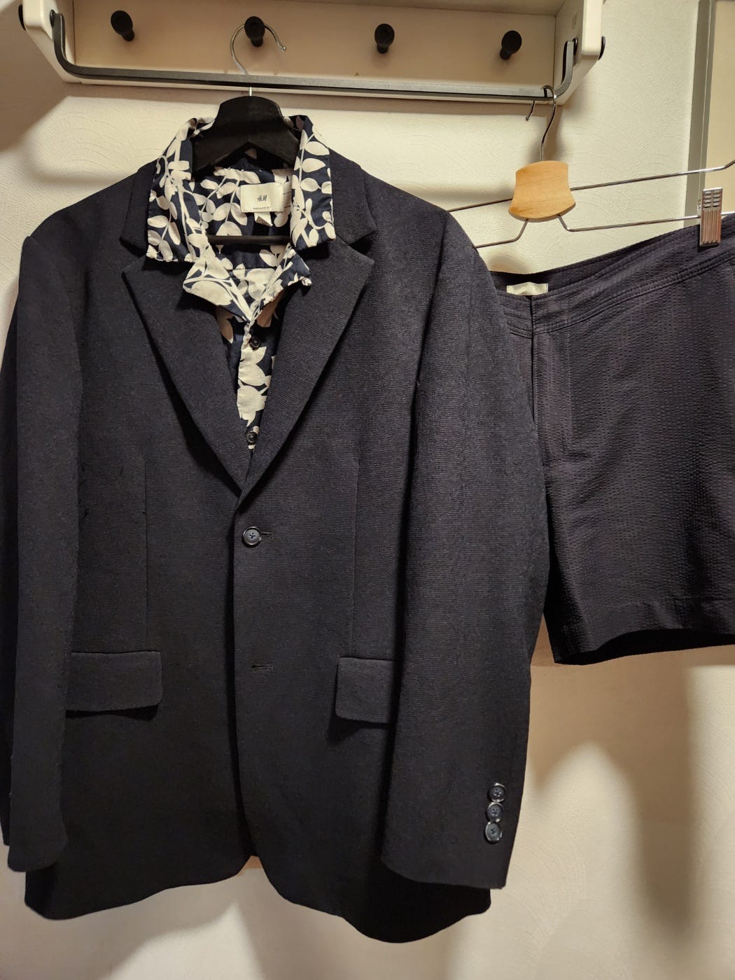 navy Renoma Sports summer blazer (it’s seersucker with a subtle sheen!) + navy H&M floral print shirt (love the Cuban collar!) + navy Arket shorts (okay, they’re swim shorts but they’re seersucker so they match the blazer) + black loafers